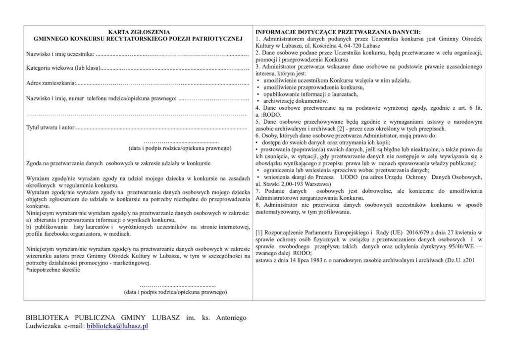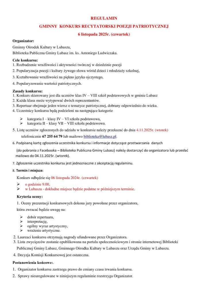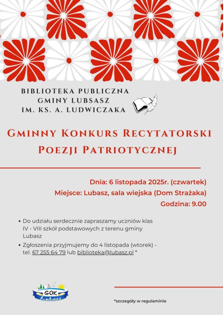 Biblioteka Publiczna Gminy Lubasz im. ks. A. Ludwiczaka serdecznie zaprasza uczniów klas IV–VIII szkół podstawowych z terenu gminy Lubasz do udziału w Gminnym Konkursie Recytatorskim Poezji Patriotycznej.