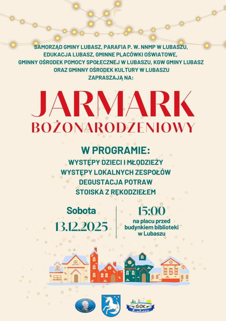 Już 13 grudnia 2025 r. o godz. 15:00 zapraszamy Was serdecznie na wyjątkowy Jarmark Bożonarodzeniowy na placu przed Biblioteką w Lubaszu! ![]()